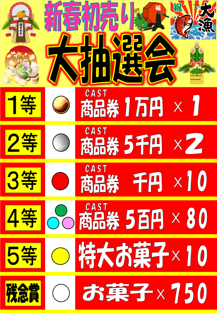 福袋お買い上げ又は商品お買い上げ1万円毎に、「新春大抽選会引換券」をさしあげます!